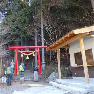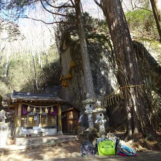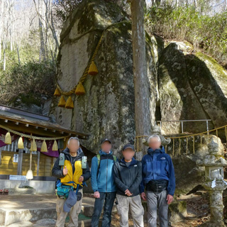 しばらく歩いて9:48 石割神社に到着。 割れた巨岩を御神体とする神社。 神社前で記念撮影も。