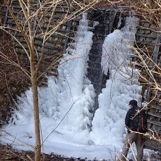 途中、砂防ダムがあり、そこから流れ落ちる沢の水が凍って、きれいな氷瀑が見られた。 12:58 朝に停めた駐車場まで戻り、スーパーと道の駅に立ち寄り、14:20