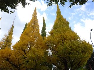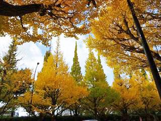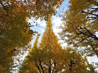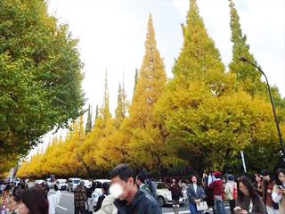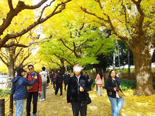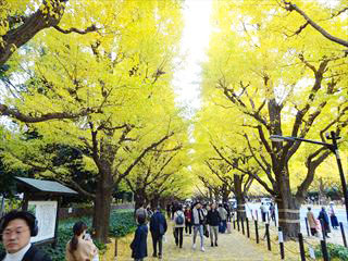 | 信濃町駅から歩いて、絵画館から直線方向に進んだところにあるイチョウ並木は、有名なスポットで外国人を含む観光客が多く観に来ています。 |