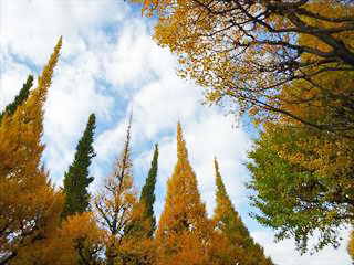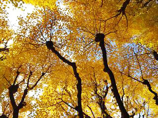 | 黄色や緑色が混じる木々がきれいに見えます。 空に広がる葉もきれいです。 |