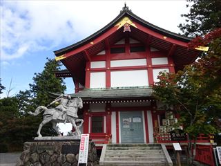 スタートから20数分で御嶽神社の下に。 階段を上がって進み、門をくぐると、騎馬の銅像と宝物殿がありました。 銅像は鎌倉初期の武将、畠山重忠の騎馬像