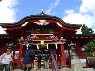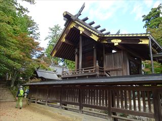 銅像と宝物殿のすぐ上に、御嶽神社の拝殿があり、朱塗りで鮮やかな彩です。 さらに奥に進むと本殿。 屋根の造りは伊勢神宮などに見られる形。