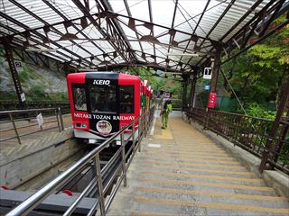 バスの終点ケーブル下駅で降車し少し坂を上って、ケーブルカーの滝本駅に。 スイカのタッチで乗車できました。ペット用の乗車券も販売されています。