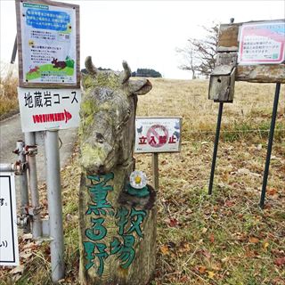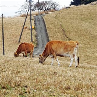 ランチ休憩後、下山開始。 下山のコースは地蔵岩コースで。 牧場の横を通っていきますが、のんびりと牧草を食べる牛を数頭見かけました。