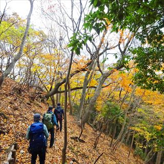 左手に牧場を見ながら急な道を下りて行きます。 その先もきれいな紅葉が楽しめる登山道で気持ちが良かったです。