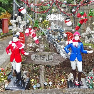 13:36 ハイキングコースの終点、そして、山北側から来る地蔵岩コースの入り口を通過。 そして、以前にも出会っている、丹沢姉妹の人形たちに出会って、このあたりから、舗装された道を進みます。
