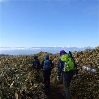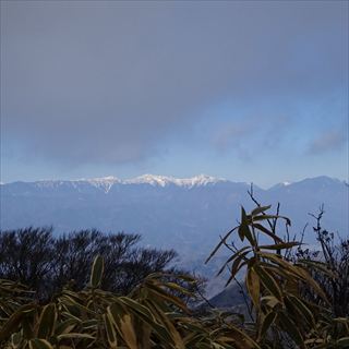 竜ヶ岳に向かう道はクマザサに囲まれていた。 途中からは雪をかぶった南アルプスも見えていました。