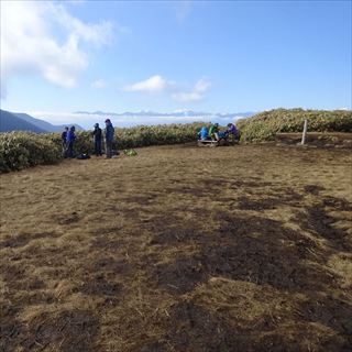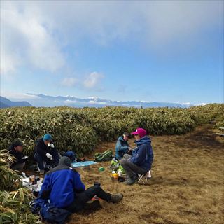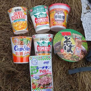 山頂ではテーブルも空いていたが風があって寒いので、熊笹のそばで風除けしてランチタイムとしました。 この日のみんなのカップ麺勢揃い。