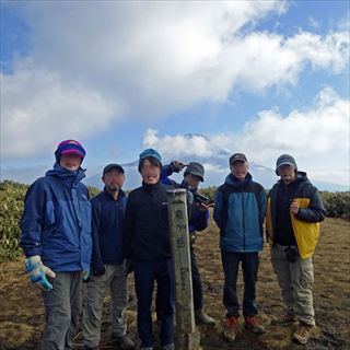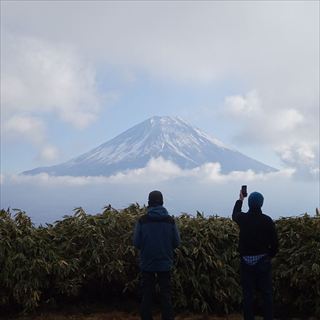 富士山は最初は雲で隠れていたが、時々雲が移動して見え始め、そしてまた雲がかかってくるの繰り返し。 山頂標識前での記念撮影。この時も富士山は雲がかかってきた。