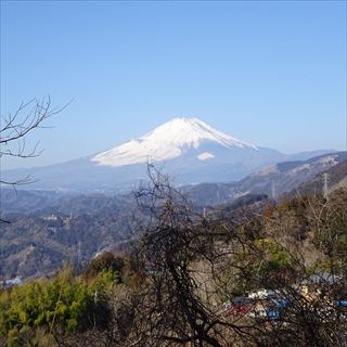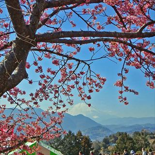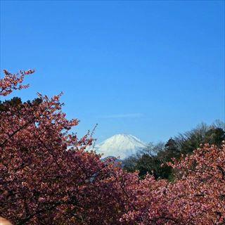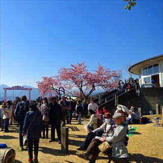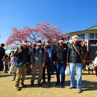 13:26 さくら祭りが開かれている西平畑公園に到着。 すでに沢山の人が満開の河津桜を楽しんでいた。 そして、富士山もきれいに。 我が隊のバス組二人も合流して、5人でお花見昼食を楽しみました。