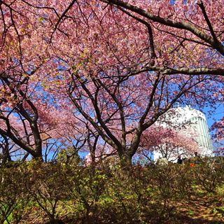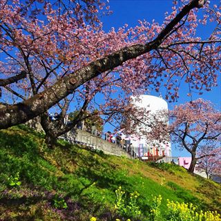白いハーブ館と菜の花と河津桜のコラボもいい感じ。