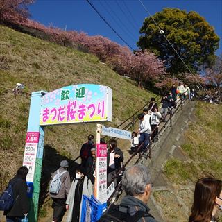 14:00 西平畑公園から下りて行きます。 菜の花と河津桜のコラボも絵になります。 下から上がってくる人や途中で写真を撮る人などで混雑していました。