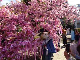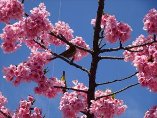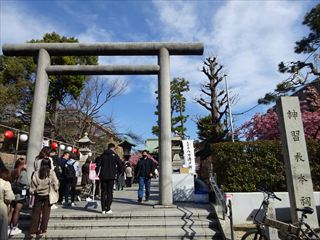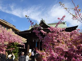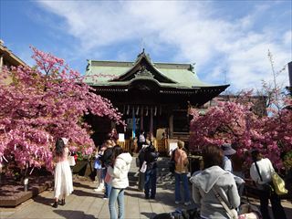 | 境内に入ると、ピンク色の桜、河津桜がたくさん。人も多く観に来ていました。 |