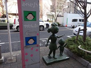 | 桜神宮の桜を観たあと、サザエさんの作者・長谷川町子記念館と美術館があるので、立ち寄ってみました。桜新町駅付近には、サザエさん一家のオブジェがあちらこちらに。通りにもサザエさん関連の絵やオブジェが、ところどころに。 |