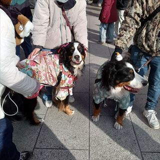 | 朝9時半頃、まだ普通に行き来できるほどの人出。 途中で着物を来たワンちゃんたちにも出会いました。 |