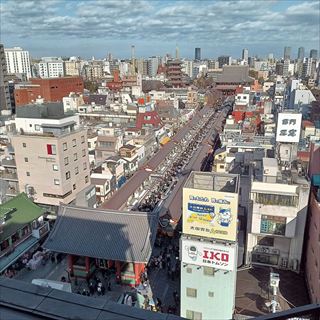 | 雷門まで戻って、通りの向かい側にある浅草文化観光会館に入り、最上階の展望フロアから周りの景色を楽しみました。 |