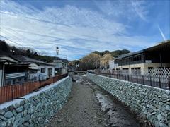 2022年最初のハイクは、8度目の高尾・小仏城山へ。 また、新年につき、高尾山の薬王院にも参拝。 高尾山口駅前に集合し、8:45にスタート。 高尾山口駅前の案内川は護岸改修工事中で既に綺麗になっていました。 |